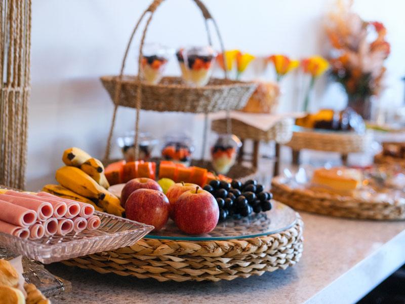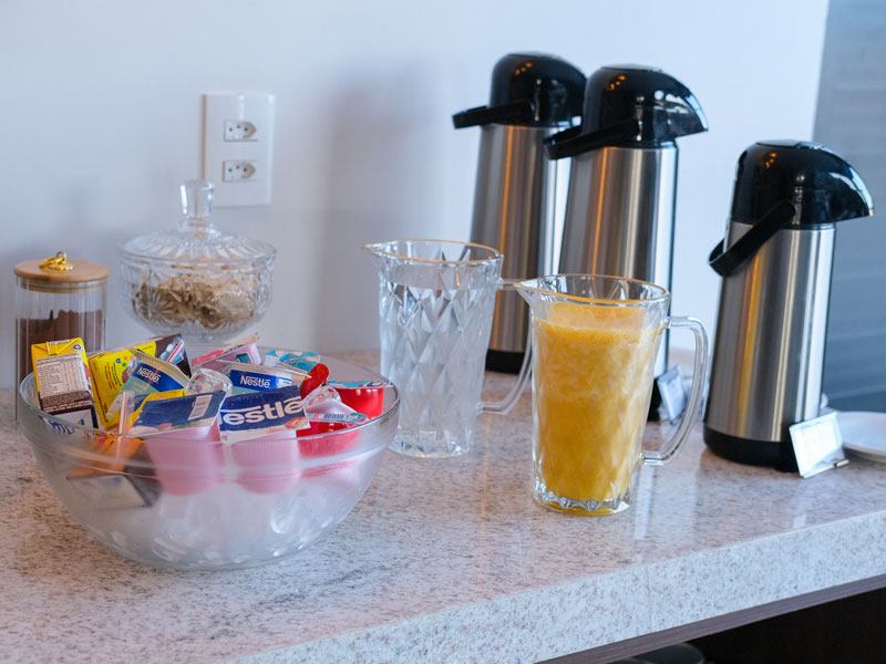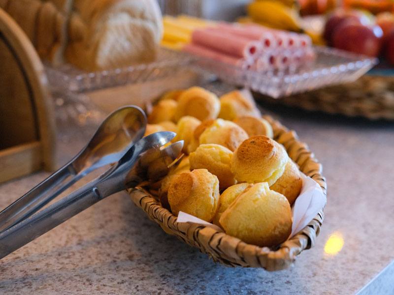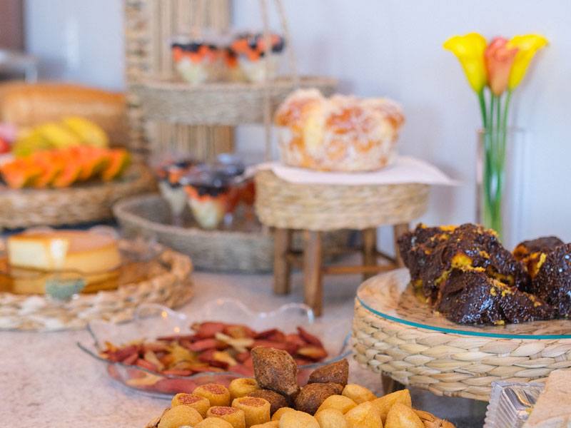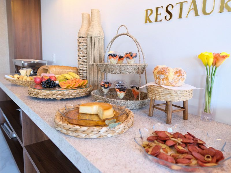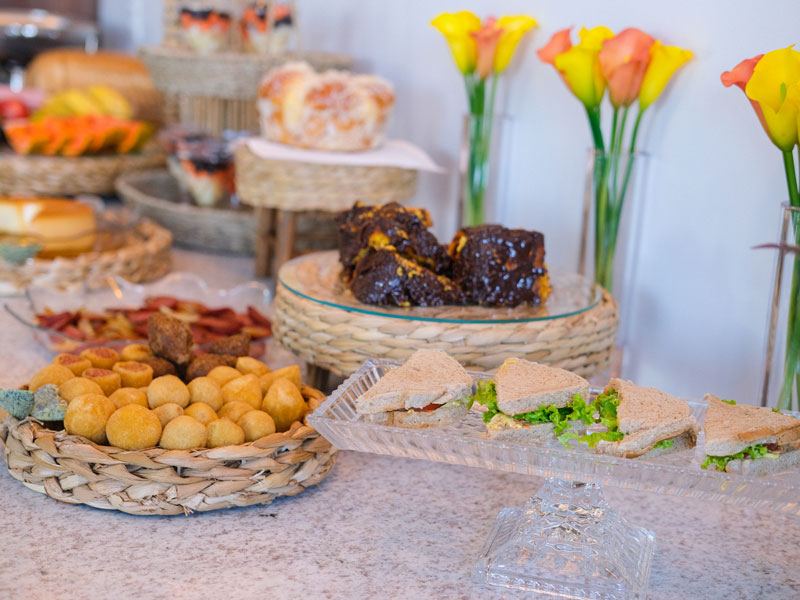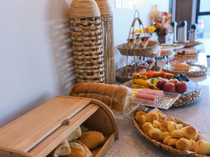 Cada item do nosso buffet é pensado para despertar seus sentidos e energizar seu dia. Desde a simplicidade de um pão com manteiga até opções mais sofisticadas como uma tapioca recheada, cada escolha é feita com carinho e atenção aos detalhes. Venha desfrutar de um café da manhã que celebra a riqueza e a diversidade da gastronomia local, no conforto e na elegância do nosso hotel. Seu dia começa aqui, com sabor e prazer.